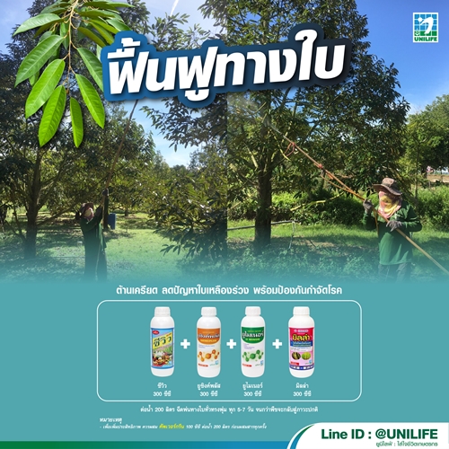 – ใช้ ซีวิว 300 ซีซี + ยูซิงค์พลัส 300 ซีซี + ยูไมเนอร์ 300 ซีซี + สารกำจัดโรคพืช มิลล่า 300 ซีซี ต่อน้ำ 200 ลิตร ฉีดพ่นทางใบทุกๆ 5-7 วัน จนกว่าพืชจะเข้าสู่สภาวะปกติ เพื่อลดความเครียดของพืชจากภาวะน้ำท่วมขัง ลดปัญหาใบเหลืองร่วง พืชจะนำธาตุอาหารไปใช้ ช่วยให้ฟื้นฟูต้นและใบได้ดี