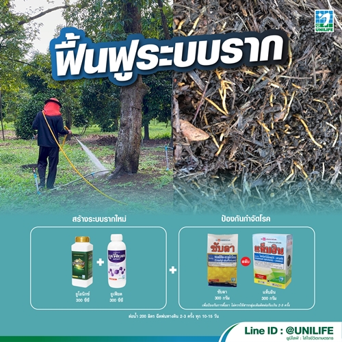 – ใช้ชุดเรียกราก ยูโอนิกซ์ 300 ซีซี + ยูเฟียต 300 ซีซี ร่วมกับสารกำจัดเชื้อรา ซับลา 300 กรัม หรือ แท็บอิน 300 กรัม ต่อน้ำ 200 ลิตร ควรฉีดพ่นลงโคนต้น บริเวณราก ทุกๆ 10-15 วัน เพื่อกระตุ้นการเกิดรากใหม่ พร้อมกับการกำจัดเชื้อราทางดิน
