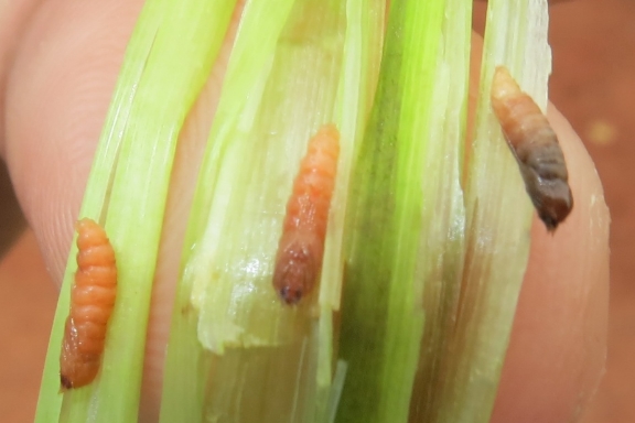 แมลงบั่วมักวางไข่ในข้าวระยะกล้าหรือระยะแตกกอ (อายุ 25-30 วันหลังปลูก) ตัวหนอนเข้าทำลายส่วนยอด ทำให้เกิดเป็นหลอดคล้ายหลอดหอม หรือเรียกว่า “หลอดบั่ว” ต้นที่ถูกทำลายจะแคระแกร็น ลำต้นกลมเตี้ย สีเขียวเข้ม ยอดที่ถูกทำลายจะไม่ออกรวง