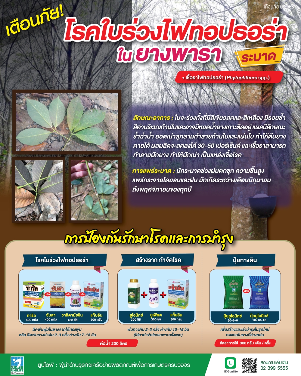 - ใส่ปุ๋ยยูโอนิกซ์ 30-9-6 สลับปุ๋ยยูโอนิกซ์ 18-18-18 เพื่อสร้างและเร่งบำรุงใบชุดใหม่ทดแทนใบยางที่ร่วงหล่น