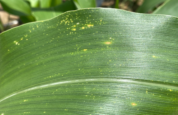 เกิดโรคได้แทบทุกส่วนทั้งบนใบ กาบใบ ลำต้น ฝัก ช่อดอกตัวผู้ โดยแผลจะเกิดด้านบนใบมากกว่าด้านล่างใบ ระยะแรกจะพบเป็นจุดนูนเล็กๆ สีน้ำตาลแดง ต่อมาแผลจะแตกออกมองเห็นเป็นผงสีสนิมเหล็ก ในกรณีที่เป็นโรครุนแรงจะทำให้ใบแห้งตายในที่สุด ทำให้ผลผลิตลดลง 17-45%